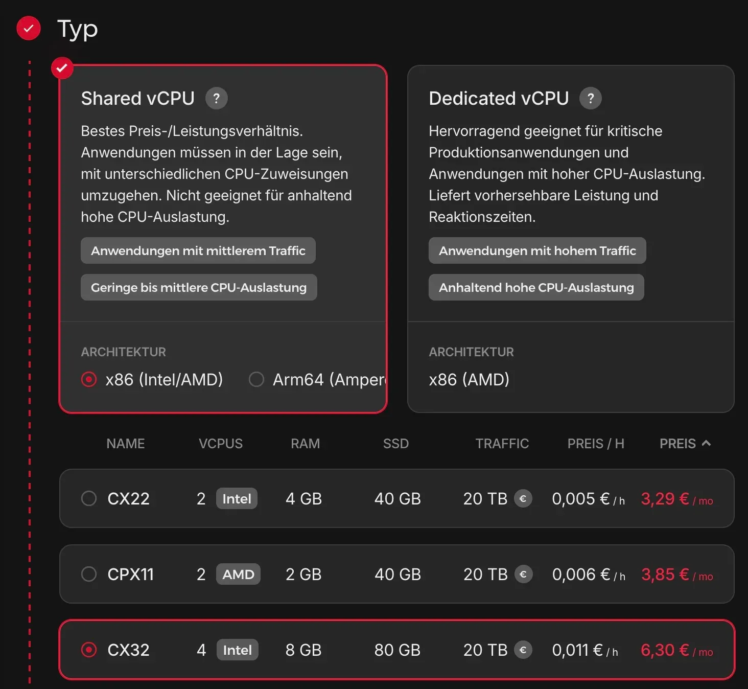 Start by creating a new server (Cloud or Dedicated) on Hetzner Cloud. For this tutorial, a small cloud instance is sufficient (for example, the CX22 plan with 4GB RAM).