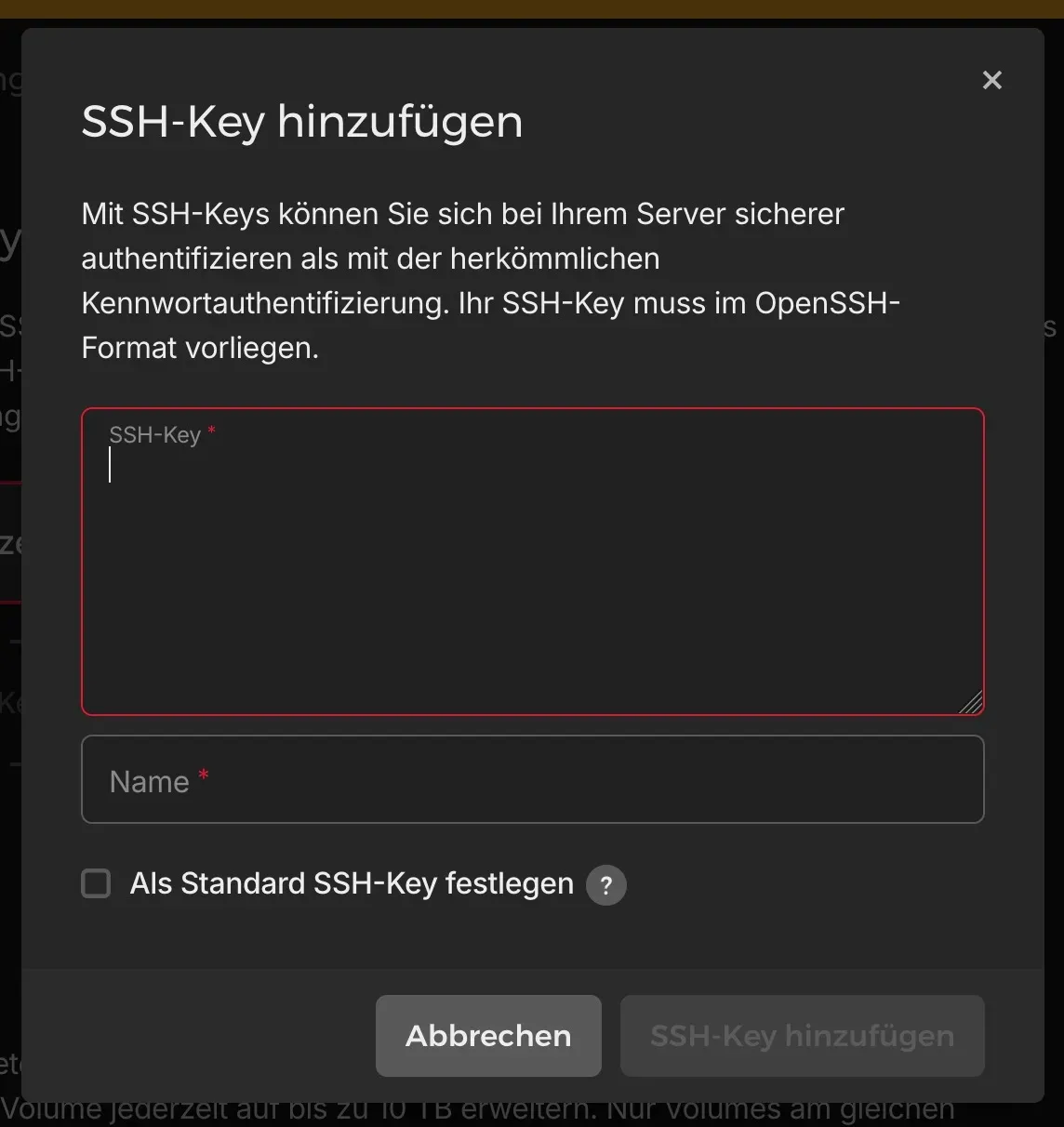 When opening the Hetzner server creation page, paste the contents of dokploy-key.pub