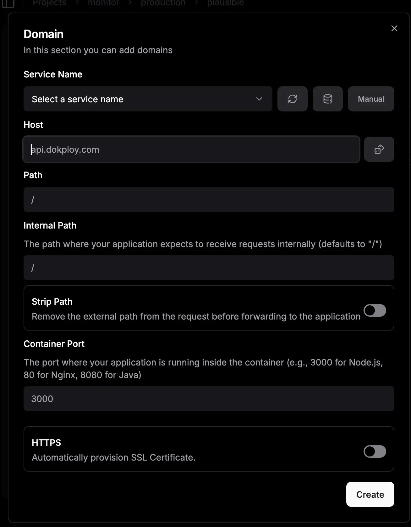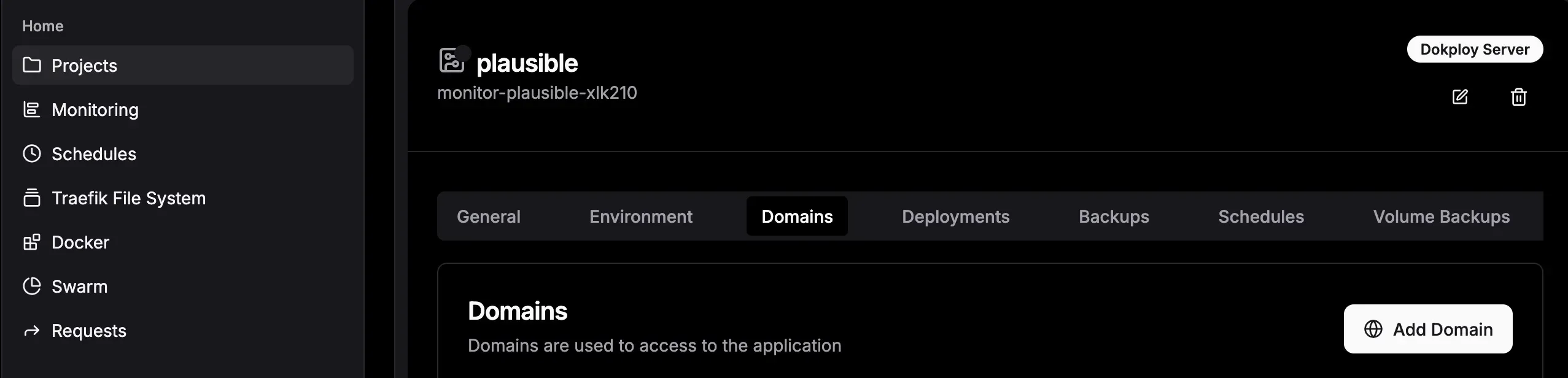 Back in the Dokploy dashboard, go to Webserver → Domain and update the domain from the default IP to your actual domain.